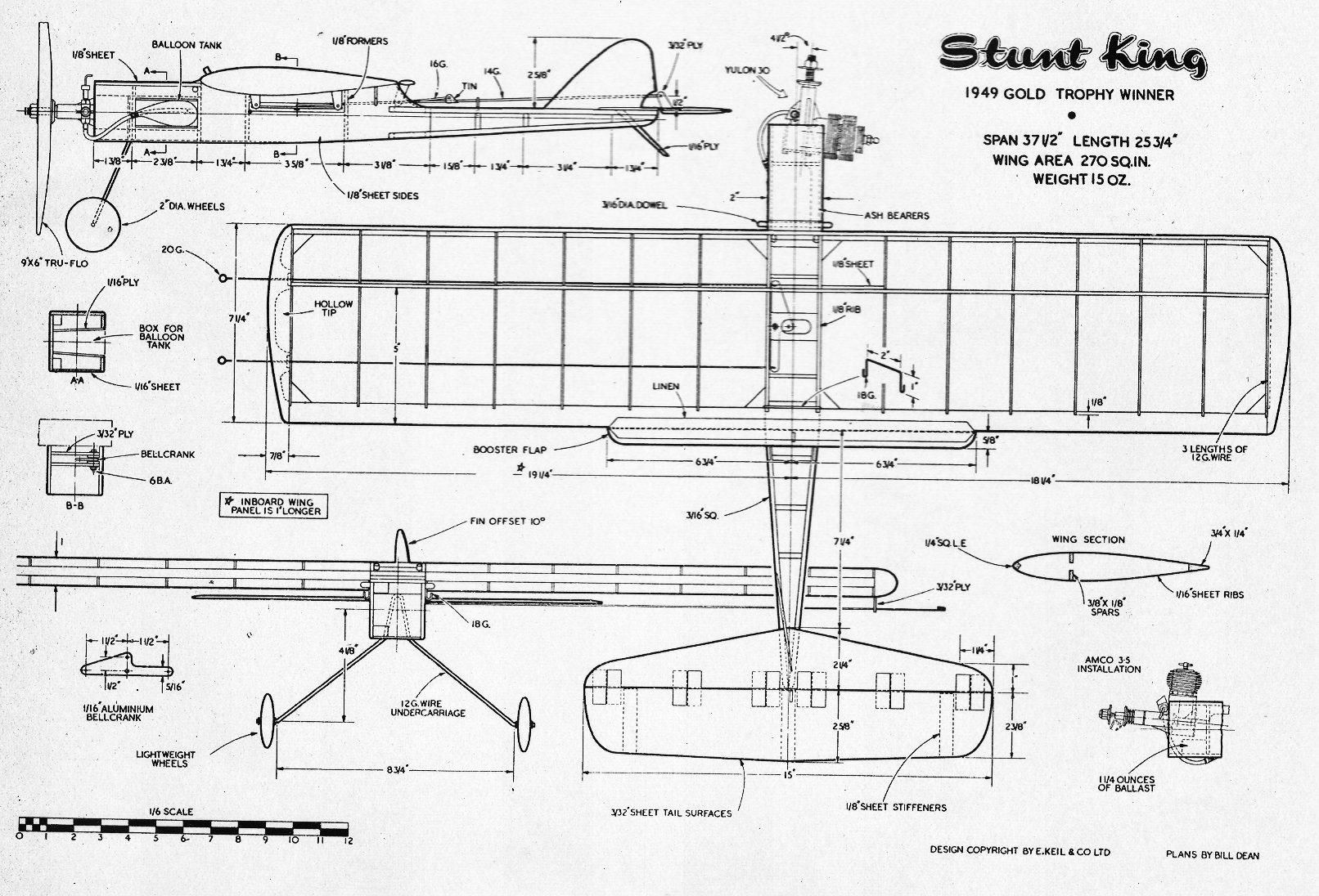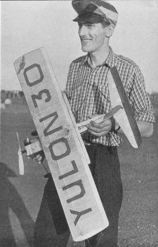 For those who are wondering just what sort of model it took to win in C/L stunt so often and convincingly in 1949, here's the plans as presented by the designer, Brian Hewitt, in the same Model Planes Annual in which the Chinn Yulon review appeared. Note the small "Booster Flap", the light wing structure, and the built-up rear fusalage. Most of the weight must have been in the engine and prop! Hewitt went on to design some quite attractive stunt models, although all small when compared to the designs being used in the USA during the same period. The Stunt King was kitted by Keil Kraft for a brief period and perhaps his 1949 success was a result of the model being too fast for the judges to see what he was doing.