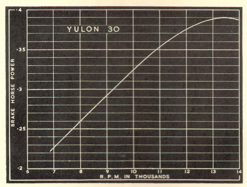To summarize, the Yulon 30 is essentially a high-speed engine, possessing an exceptional power-weight ratio and is well suited to stunt and speed control line models and to high-performance free flight models of the larger power-duration type. There is little doubt that, for a stunt model of around 300 sq. in. wing area, few engines, British or American, are able to equal the Yulon.