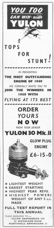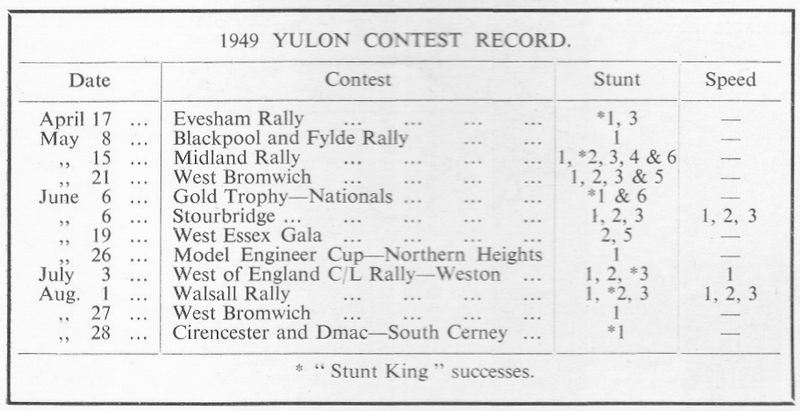 ONE of the highlights of the 1949 competition season has been the outstanding performance of stunt models powered with the new British Yulon 30 glo-plug engine. Commencing with the Evesham Rally on April 17th, and in the space of five months, the Yulon has piled up an impressive list of contest successes which, in addition to the two most important trophies, the old and Model Engineer cups, has included first places at the Blackpool and Fylde Rally, the Midland Rally at West Bromwich, Stourbridge, the Weston Rally, the Walsall Rally and many other stunt contests too numerous to mention, plus a first in speed at the Weston Rally and 1-2-3 placings in speed events at Stourbridge and Walsall.