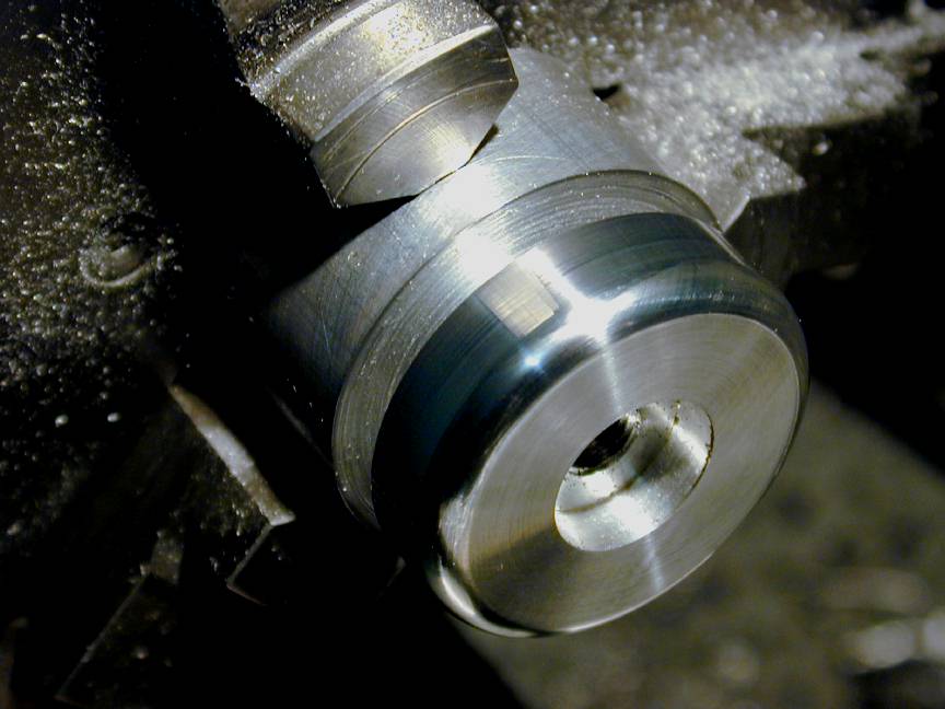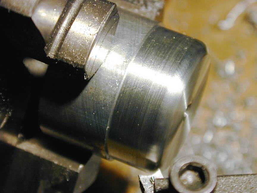 And here we are after the edge has been radiused. Care needs to be taken not to nick the top or side with the extreme ends of the tool by plunging in too far. Now use a parting off tool to cut down to the diameter of the portion that will insert into the bore (this can be seen clearly in the next shot). Use a right hand tool to ensire what will be the underside of the head has a good finish that is perpendicular to this section.