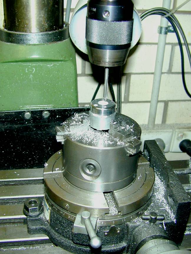 Zero the rotary table, wind the mill table out to the correct hole radius, and start drilling and counterboring for the six hold-down screws. In the shot here, the first hole is complete, the second drilled, and the counter boring tool about ready to cut to depth for the next. Now, do you center drill six times, drill six times and counter bore six times, or do all 3 operations on one hole before winding the table around to the next? I think it's six of one, and half a dozen of the other (*groan*). With a keyless chuck, tool changes are quick compared to cranking the table handle, so I'm completing each hole as I go.