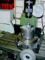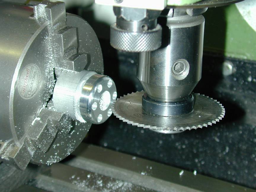 Now the table is oriented vertically, with the bolt holes aligned "fore-aft", per the drawing, for fin-slitting. A 1/16" slitting saw is mounted and brought down to touch the top of the head. The Z axis is zeroed, then lowered by a distance of one half the sum of the head diameter and cutter thickness. At this point (as seen here), the Z axis is re-zeroed. All cuts will now be plus or minus from this datum.