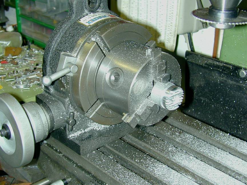 This rather dark shot shows the special shop-made radiusing tool used to finish the head to the drawing spec. The tool (seen better in the next photo) is a three flute cutter with a 1/8" radius turned in before gnashing with an end mill. The ends of the teeth are relieved with a swiss file before hardening and tempering. Finally, the cutting faces were touched up in the Quorn, but a hand held Dremel tool could probably have been used, with care, to achieve the same result.