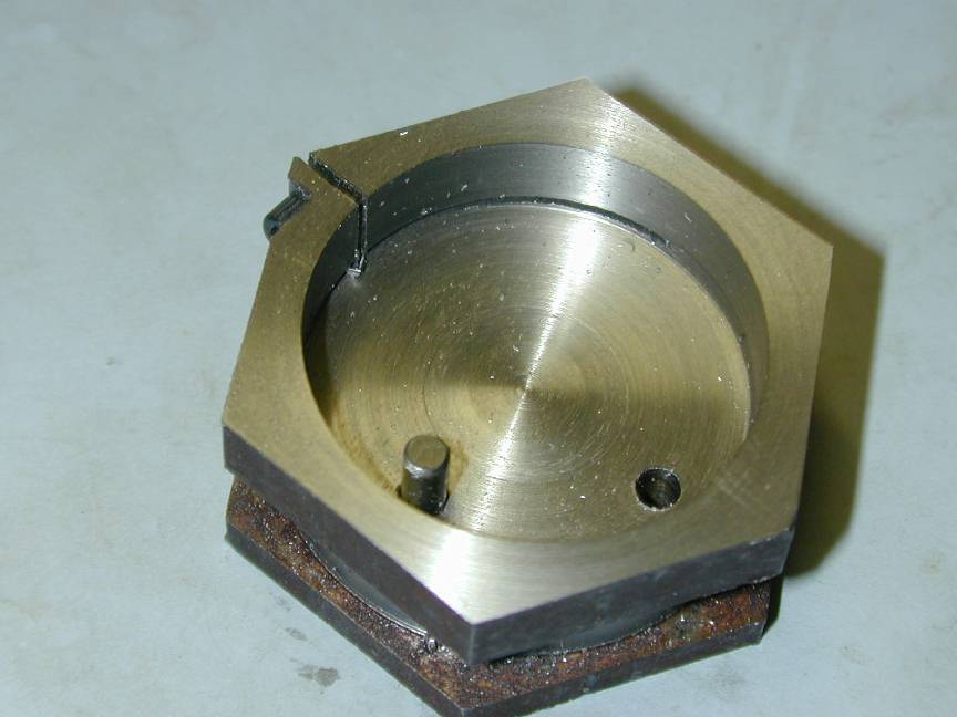 Profiling the combustion chamber side of the head requires a special holding fixture. This is very conviently made from a piece of hex steel from the scrap box (thanks Kerry!), bored to a close sliding fit of all heads and deep enough to not quite enclose the entire external head height. The jig is then drilled and tapped across one of the peaks before being cut half through at the "floor" position, then across the drilled peak to form a hose-clamp like fixture. Finally a 1/8" peg is mounted to align the heads via a mounting hole. You may notice an extra hole. That's because I got the position wrong the first time. More on this later.