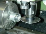 Starting from the bottom, each fin gap requires two overlapping cuts with the offset from zero taken from the table calculated back at the CAD drawing stage. The cutter is run at the highest possible speed for this, cutting dry. Dry because I've no coolant pump, and it makes enough mess as it is. I don't like to even think about adding liquid to this operation!