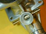 Not a lot to say about the spraybar. It's turned from 1/4" diameter brass. The thread is 3BA--a bit unusual, so I had to make nuts as well. It uses the "2 jet hole" design, which theory says should be superior to the "single, down-stream jet" type. Why? The air-flow in region under the spraybar will be turbulant, while that at either side will be smooth. Theory says therefore that atomization and fuel draw will be better from a jet positioned on the "side" of the spraybar, compared to one on the bottom. So where do we mostly put the hole? On the bottom of course. Also noteworthy is the venturi insert visible in this shot. This was provided so the engine could be supplied with conventional needle and spraybar, or as an R/C variant, with throttle in place of the insert.