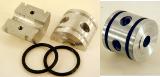 It's been a long time between drinks; here I am in December 2001, almost 12 months since the drawings were made and my twin is still not finished. Maybe it can be done before 2002; we'll see. But there is progress--I know from a lifetime of unfinished projects why my unfinished projects become, well, unfinished. They all stall waiting on a step that I either don't have a satisfactory process worked out in my mind, or I have a process that is so un-fun, I don't want to start it. I also know from experience that when I start, the problems turn out to be non-problems and progress is swift, but have I learnt from this? Apparently not. The Twin stalled on the center bearing. I managed to destroy three slitting saws trying to horizontally split a piece of bronze rod so it could be soldered together and turned into that bearing. Ken Croft had told me he'd simply made his out of dural, so finally (after a long break), I decided to follow suite. In the photo block below, we see two pieces of 3/8" 2024-T6 plate (with old zinc chromate primer) that will form the split bearing. In the next shot, they have been drilled, tapped and counter bored for the 2-56 cap head bolts that holds the bearing together. Next, they have been drilled and reamed by centering the block in the 4-Jaw chuck on the lathe. The mating faces were lapped on 800 glass paper and a surface plate before this step, so the bearing fit should be good after re-assembly.