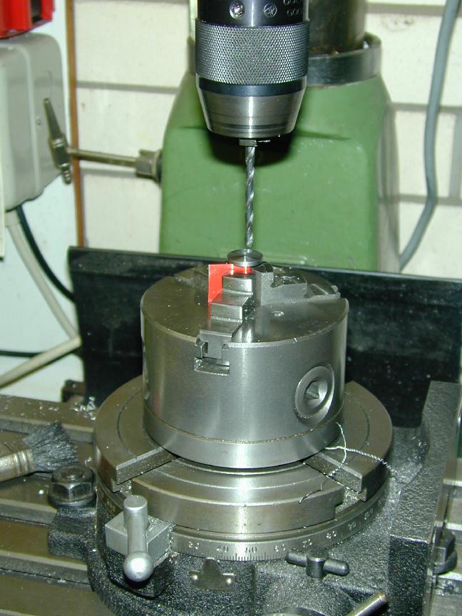 The center crankshaft was designed to have both the crankpins; the forward one being made longer to engage in the forward shaft. This makes assembly quite simple. I'll call this part the "bobbin" for historical reasons. It was turned between centers using a screw (8-32) tapped into the long (front pin) end as a lathe dog. This allowed me to work with a length of material that was almost to length and that simplifies follow-on operations. Note that the OD of the crank webs are also turned at this stage. It is important that these be concentric with the shaft and of precisely equal diameter because they will align the shaft while the pins are turned. Simple to do all this between centers as shown in the first photo of the next sequence. Note also the shape of the tool being used to form the shaft. It has a concave face with radiused points at either end. With carefull setup of the tool, this allows left/right traversals to accurately turn the shaft between the two crank webs. Next the bobbin is clamped lightly in a V block so an accurate centerline can be scribed on either end to ensure the crank pins are at 180 degrees to each other. The bobbin then goes into the 3 Jaw chuck, mounted on a rotary table under the mill. The chuck is centered, then offset by half the crank throw. With the bobbin in the chuck, the rotary table is rotated to pick up the scribe line. It can then be center drilled to locate the crank pin. This set-up will be left untouched so the bobbin can be returned to center drill the other end after the oversize area (caused by the drive dog screw) has been turned into the front crank pin. To form the pin, the bobbin is held in a "Keats" angle plate mounted on a lathe faceplate. A dead center in the tailstock gives approximate alignment, followed by a wobbler and DTI to finalize the setting. This setting will be used on the other end as well, ensuring equal throw. All that's needed is to reverse the bobbin, then rotate it until the DTI and wobbler show that the crankpin mark is running true. The front shaft is just a simple turning job as it has no crankpin. Finally it is returned to the rotary table under the mill to drill and ream for the crankpin driver as shown in the last photo of the next sequence. As that setup has not been moved, the alignment should be perfect, right? Well I don't believe in tooth faries either. On assembly, a slight but noticable drag could be felt at one point as the shaft was rotated. This corresponded to BDC for the front crank pin, suggesting the lineup was not perfect. There was no way to easily tell which way the hole needed to move, so I took a guess and gave a few strokes with a round needle fine towards the center of the shaft. On reassembly, the drag felt less, so it got a few more strokes. Repeat once more and the two shafts rotate as freely as a conventional single throw, one piece crankshaft. Perfect. Since I never make any "perfect" parts, I now needed to stuff it up in some way. My design called for a shallow, blind hole, tapped 4-40 in the center of the back web. This would allow a special tool to be inserted to pull the assembly out after the rear conrod had been removed. Guess who broke a tap in the hole? Right first time (bugger). Rather than make a new bobbin, I drilled a hole in the face of the back web, opposite the pin (you can see it in the exploded parts view). I probably should drill a coresponding balance hole in the front web, but I'm too ashamed.