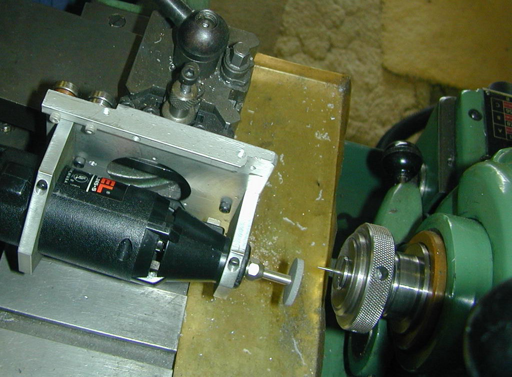 The tooling is based on the now inexpensive high-speed hand tools made by Drelmel (R) and others. A special holder is required to clamp the tool roughly on the lathe axis so it can be used as a tool-post grinder. The Dremel's bearings are not good enough to use it as a tool-post grinder capable of grinding crankshafts and cylinders, but with a little work, it will do a more than adequate job on needles. In this photo, two clamps made from 1/4" thick aluminium plate are bolted to an old dead disk drive plate to hold the tool. A bar on the underside of the plate allows it to be quickly mounted in my lathe's quick-change tool post. With the bar removed, this jig is also used in conjunction with a guide and table assembly to slice up carbon fibre sheet for free-flight wing spars.
