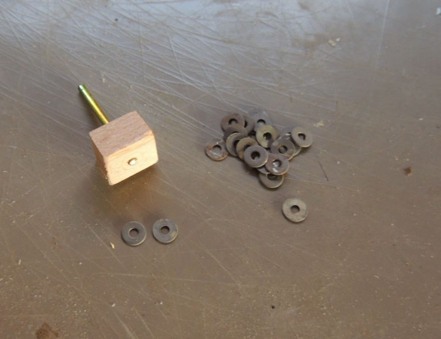 For that, we will use a simple jig comprising a small block of hardwood with a piece of 3/32" piano wire firmly inserted in it. Note the two washers. Because they have been formed by stamping, one side will have a light, raised, sharp burr edge; the other will be slightly rounded. Let's call this side the top. It is far easier to clean the top (rounded) side than the other as that would require first removing the edge burr before you can get near the surface.
