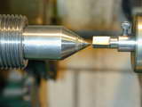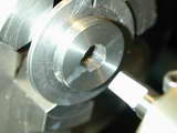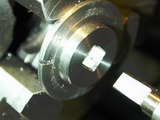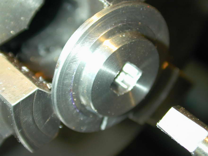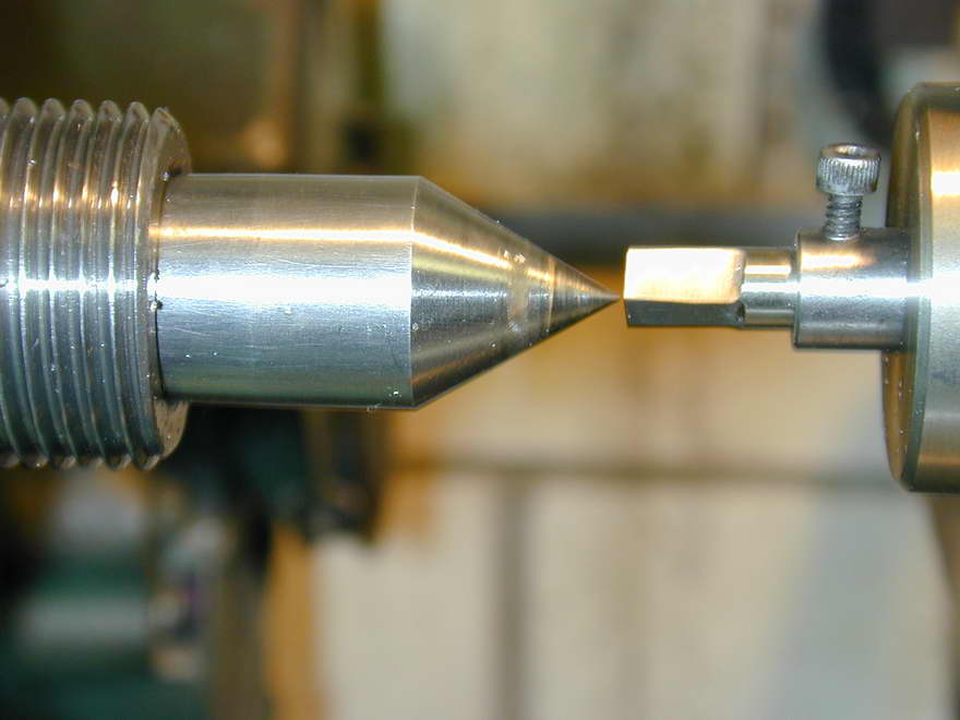 The last job is to align the cutter so that the axis of the tool is aligned with the lathe centerline, as is the corner of the cutting edges. This photo shows this job being accomplished with the help of a lathe dead-center. Of these, getting the axis of the tool precisely on the plane of the lathe centerline is the most important alignment as otherwise, the nibble will be skewed. But rotation is important too as we will index the cutter towards us with the cross slide and a moment's thought should reveal that the result will be a bit graunched in the center of one flat if the cutter tip is not on centerline.