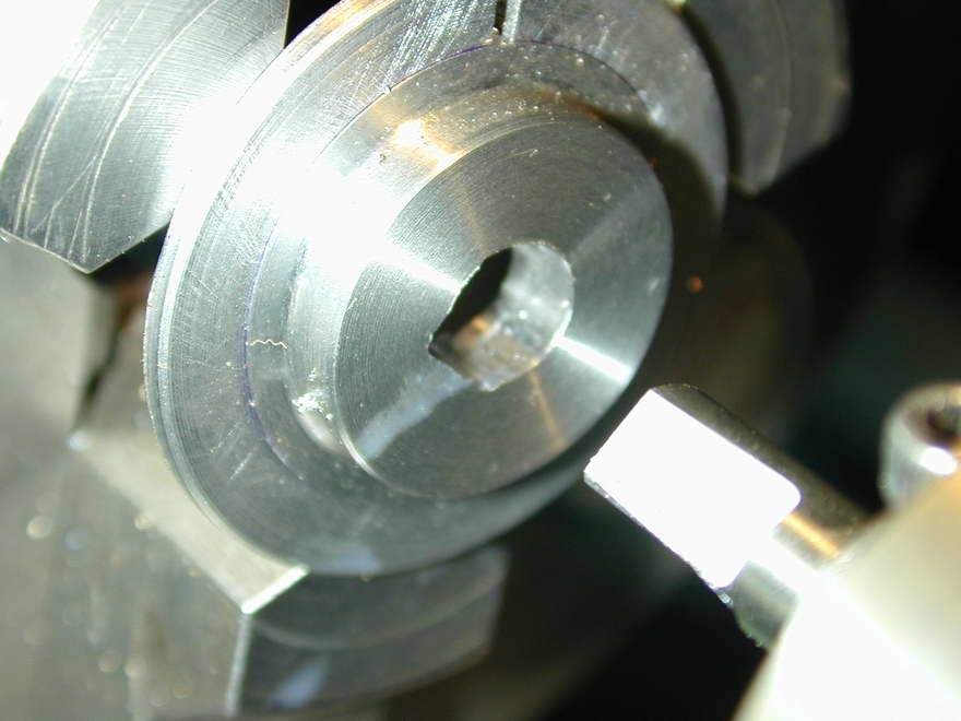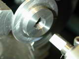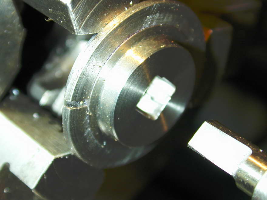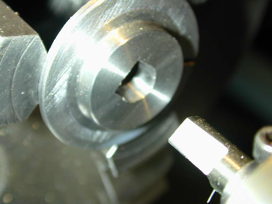 The photos above show the progressive result, left to right, as the corners are nibbled out. Start by jiggling the tool neatly and cleanly into the hole and set the cross slide dial to zero in this position as a reference. Withdraw the tool and wind the cross slide two or three thou towards you, then wind the saddle towards the headstock. The resistance will feel like almost nothing, but the amount of metal being shaved off will increase as the depth of the cut increases, progressively increasing the push required. If you make the cut too shallow, the tool will probably just deflect and rub. Too deep and it will jam, and deflect as well. The tool is thin, so it will spring back no matter what you do. This is why it is important that the edges be sharp. A bit of trial end error will give you the comfortable numbers. As you near the end, make several strokes at the same setting until the tool stops cutting and is just rubbing. Repeat three more times, indexing 90° between cuts and you are done.