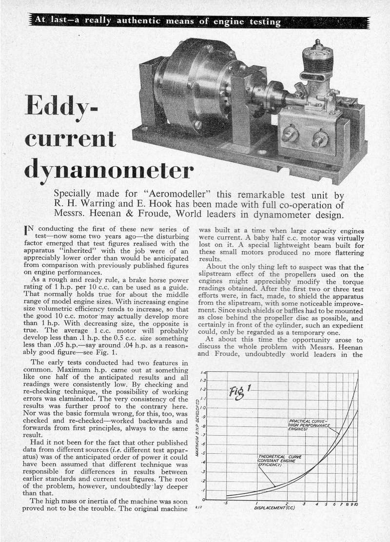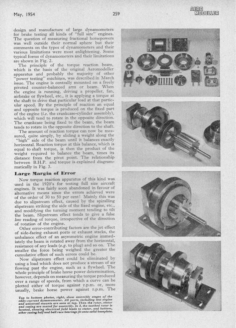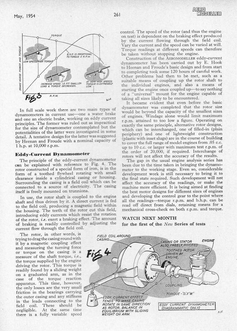 As far as I'm aware, only Aeromodeller have employed a device like this. As noted in their May 1954 article that introduced the device, it is not suitable for testing small engines. Like all the torque measurement systems described on this page, the challenge is in calibrating the mechanism. The article below gives a basic description of the device and its construction. The following one in Question and Answer format give the effect it had on testing and the implications to the results obtained from earlier model engine reviews using less accurate methods.