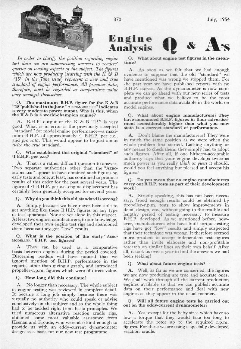 This is a tricky subject. With a few exceptions, it is also a subject whose secrets have been rather closely guarded by those who have made a career of it through the model press. But if the experimental process is not disclosed, what faith can we have in the results? Conversely, does it matter? If engine reviewer X uses the same technique for all his tests, a comparison of the numbers rather than the numbers themselves can be a reasonably reliable performance indication. But as pointed out by Gordon Cornell, peak torque and BHP are only part of the story; how many times do you see a figure quoted for fuel consumption?