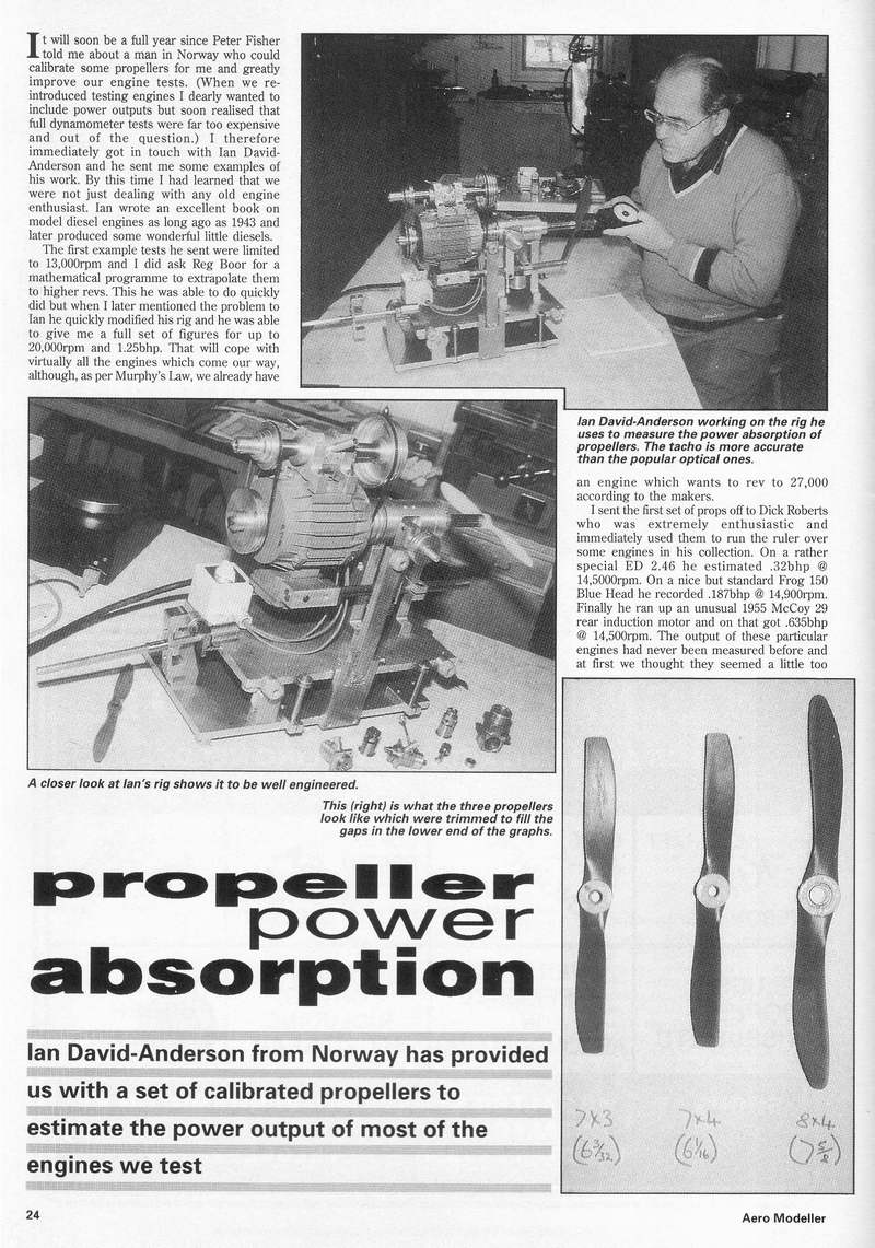 The answer is to derive your own numbers for your own chosen props. This also permits you to trim a prop to modify its power absorption curve so as to achieve a more evenly spread set of props (see the spacing of the curves on page 25 below). When Aermodeller resumed engine testing in the 1990's, they obtained for their testers sets of specially prepared props from noted Norwegian expert, Jan David-Andersen (note the spelling error in the articles where he is named Jan David Anderson and Ian David-Anderson (I assume they really mean Jan David-Andersen, but I could be wrong).