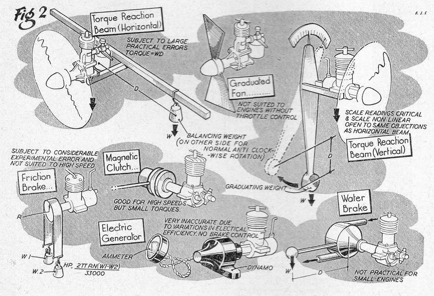 This drawing appeared in the Aeromodeller of May, 1954, and does a good job of illustrating the various means available to us for measuring the torque of a model engine. It was included in an article that described their recently introduced Eddy-current Dynamometer (noticeably absent in the illustrations) and marked a change of the guard in engine testing at Aeromodeller as Ron Warring took over from Lawerence Sparey.
