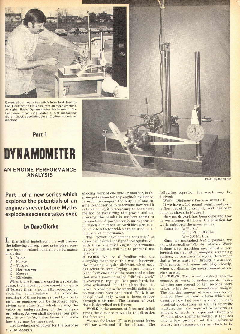 This was published as a three part series in Flying Models magazine, starting with the June 1973 issue. At the time, Dave Gierke had established his name through some very nice control line stunters, plans for which had appeared in FM. To-day, we know him as the author of two very nice books on model two-stroke engines. Dave was a technical school teacher and developed his torque-reaction dynamometer as a project in conjunction with his students. The series runs to a total of twenty-four pages, covering the construction, theory, and operation of the device. It is the most comprehensive article on model engine testing that I've ever seen, devoting considerable space to measurement and compensation for all the variables involved.