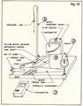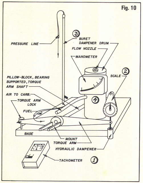 The force is measured by a spring balance positioned 10.08 inches from the axis. The reason for selecting this rather odd looking value was to simplify calculations. The BHP figure will be found by dividing the torque by 33,000 Foot-pounds per minute, but as the torque for a model engine will be best measured in ounces-inches, the constant must be multiplied by 16x12 giving 6,336,000. The torque will be Force times Distance times RPM, where the Distance is 2Π (pi) times the radius of the arm. Dave Gierke selected his arm length such that all the constants on top of the equation multiplied out to 63.36, so instead of having to remember a telephone book number as the devisor, it becomes a simple 100,000. Now all he has to do to get the BHP is multiply the Force reading in ounces by the RPM figure and shift the decimal point five places to the left.