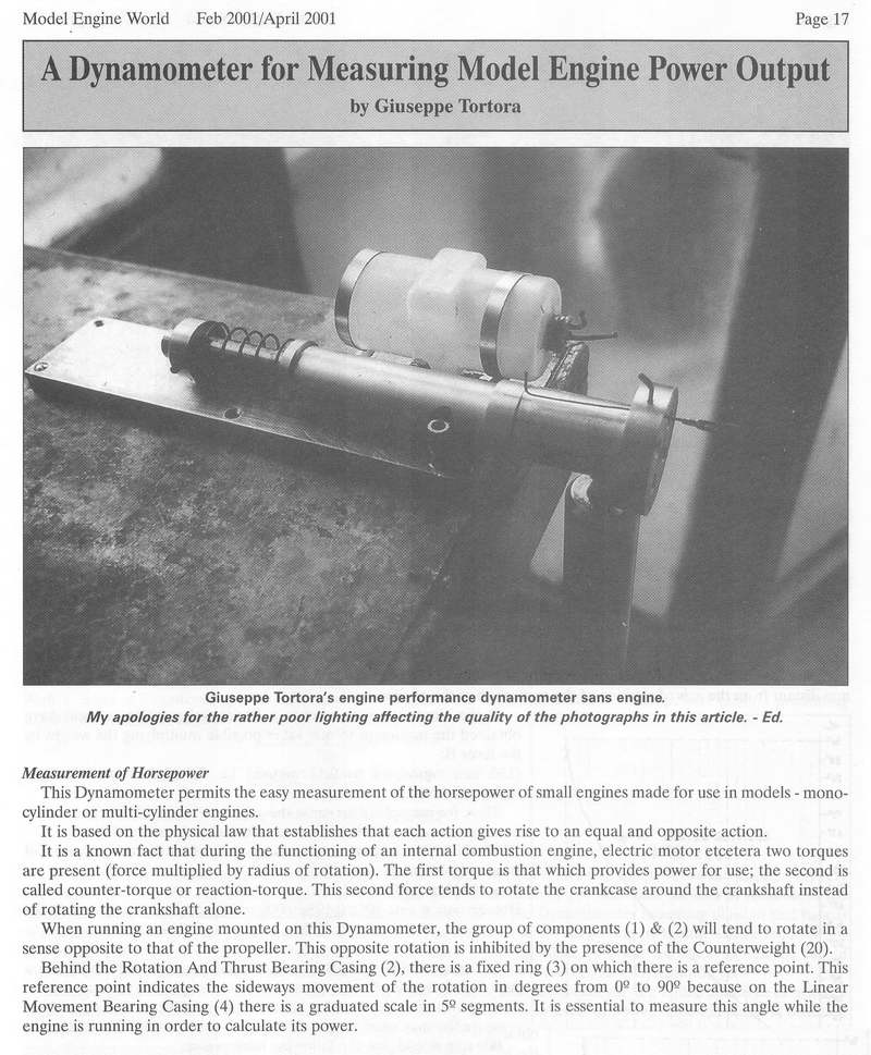 The last issue of Model Engine World edited by John Goodall was notable for a number of reasons. It carries Ken Croft's superb Delong Diesel on the cover, and contained plans for the last of Tom Crompton's EZE engine series (a horizontally opposed CO2 twin), plus construction details for a simple torque reaction device by Giuseppe Tortora. This one is considerably simpler than Dave Gierke's, but lacks a lot of the features of the latter and has no way of locking the mount during starting and tuning. With a known pendulum mass attached at a known distance from the axis, torque and power are calculated by reading the deflection of the mount in degrees and recording the engine rpm and applying a formula. Again, a series of props imposing different loads will be required if a curve is to be produced. The formula quoted in the article is: