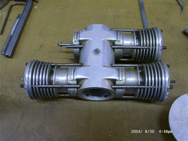 Next, notice from Photo 1 that each cylinder sits on an aluminium platform that is separate from the case. David of Bourke Engines had emailed not long prior to this, suggesting that this Watzit was based on Russell Bourke's design where the volume under each piston is sealed around the Scotch-yoke rod--feasible because the rod's motion is linear--thus providing each cylinder with its own independent, two-cycle transfer pump. All that's now missing from our mystery engine is some means of delivering one-way fuel-air mix to the four "pumps" formed by these plates and the pistons. So the engine, as it stands, still won't run, but I think we can now say that the builder was following a workable concept.