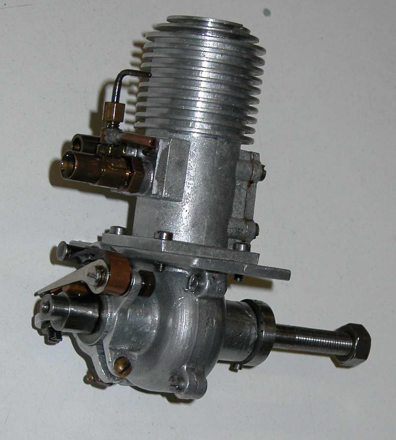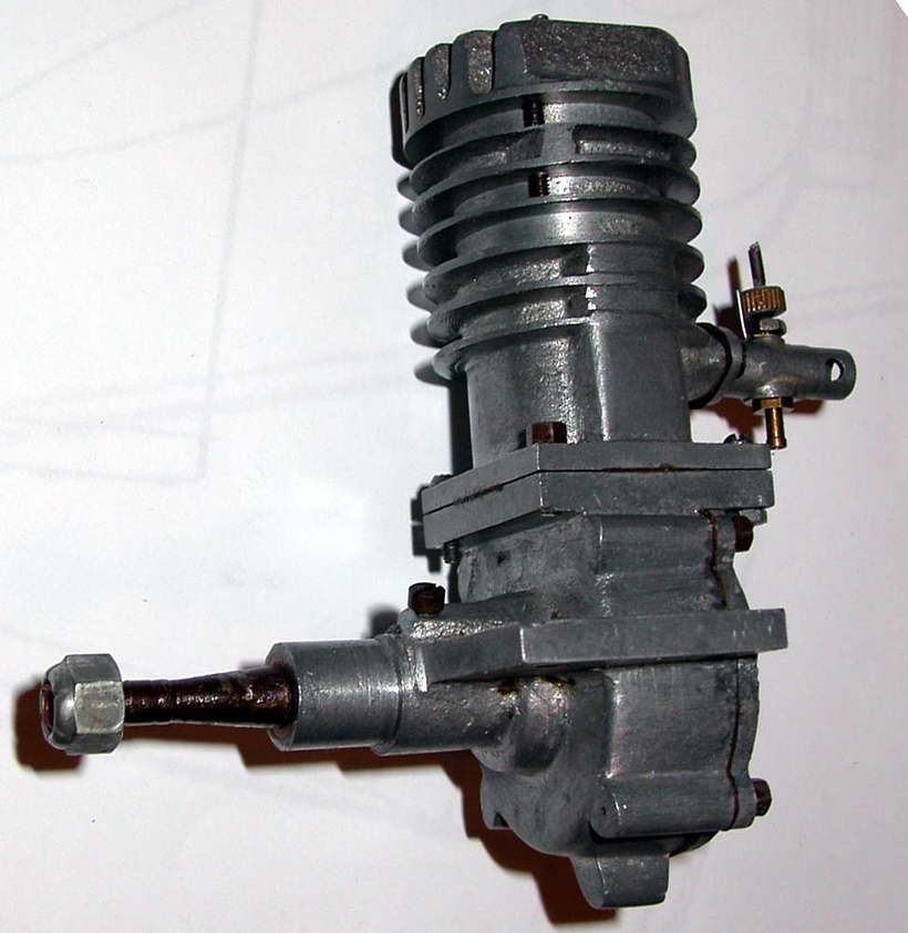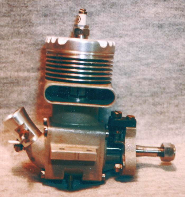 Here, for a change, is an engine we have no idea about, but rather think we should. Most obvious, it's a 10cc sparker almost certainly intended for tether car application. It shows influence of "modern" design, so we guess it comes from the late 40's to early 50's. We have reason to think it is Australian (but it's not a Tempest, and it's not a Hurricane). The engine is in the extensive collection of the late Leo O'Reilly, the owner of the "Modelflight" stores downuder and a major importer of modelling goods for sale to the Trade. If anyone can help, email through the address at the bottom of this page.