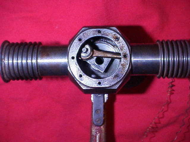 The new owner came by the engine in an estate sale where it was found in pieces in a box of airplane motors. The parts included a flywheel. The cut-down airscrew seen on the reassembled engine was chosen for demonstration purposes. The owners believe the engine may have run at some time. The basic idea is to dribble raw fuel into the crankcase (which is spinning). The exhaust valves stay open after top dead center to draw air into the cylinder on the down stroke. A valve in the piston then opens to admit fuel vapour into the cylinder. Gnome later did away with the piston valve (too many failures and explosions), turning to a Monosupape design (one valve) with two-stroke like poston ported induction (but still a four-stroke in operation; fascenating and well worth looking up in the various reference books such as The Rotary Aero Engine by Andrew Nahum). The Gnomes were made as 7, 9 and 14 cylinder engines, but there appears to be no reason why a two cylinder version would not work. The power to weight ratio would not be great, but this engine may have been designed at a time when the rotary represented the peak of technology. Please let us know if it rings any bells with you.